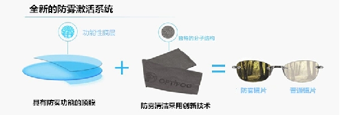 經(jīng)過(guò)特殊工藝,在鏡片的表面附上一層有防霧功能的膜,以達到防霧的目的,有效避免水霧凝集在鏡片表面。